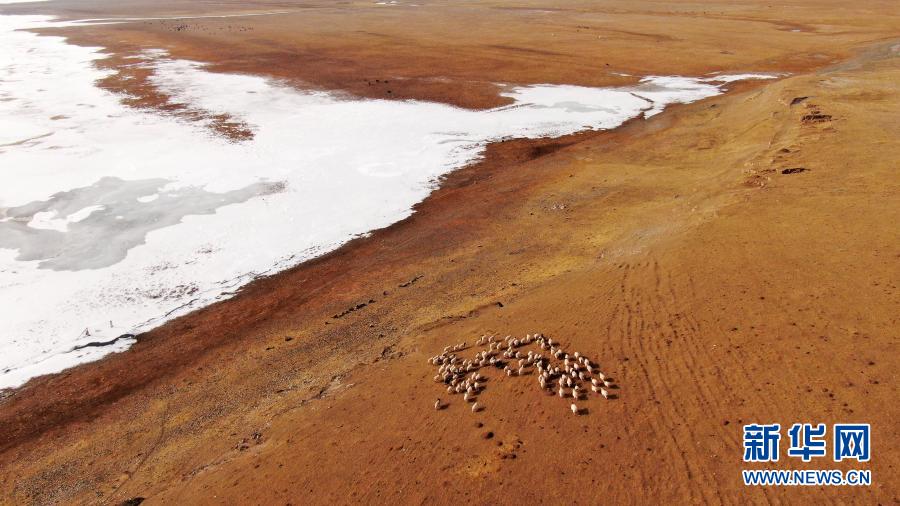 12月17日,羊群走在被冰雪覆蓋的青海湖湖畔(無人機(jī)照片)。新華社記者 張宏祥 攝