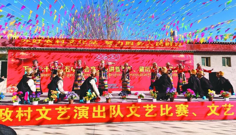 圖為瓊結縣下水鄉(xiāng)各行政村文藝演出隊演職人員在組織開展春節(jié)、藏歷新年文藝演出活動。