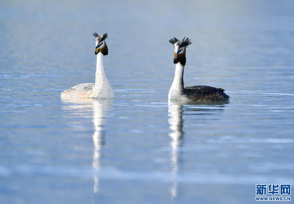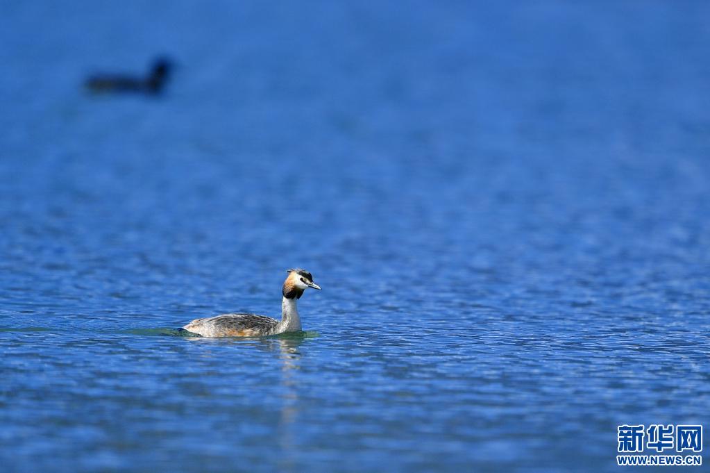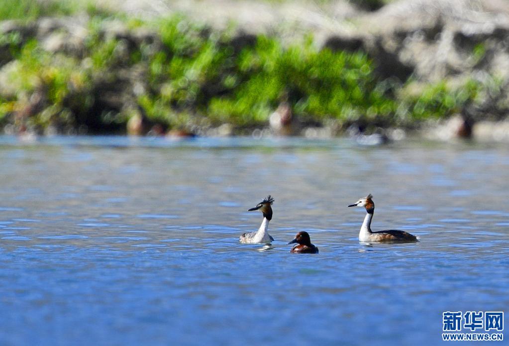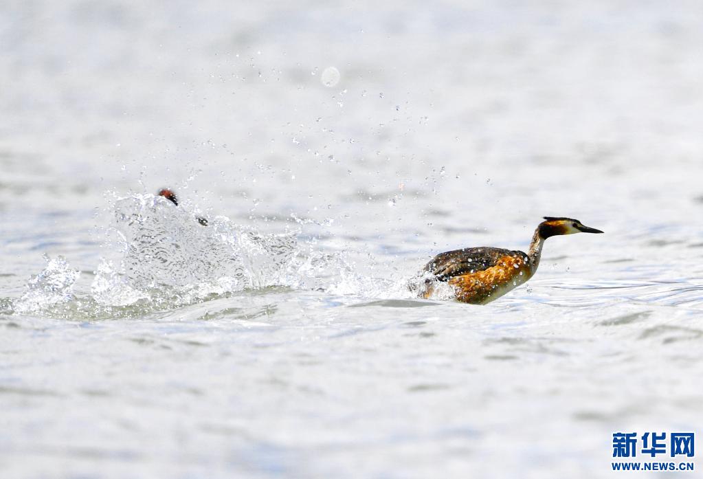 夏日里,鳳頭 和小 在西藏拉薩拉魯濕地國家級(jí)自然保護(hù)區(qū)水面上嬉戲。