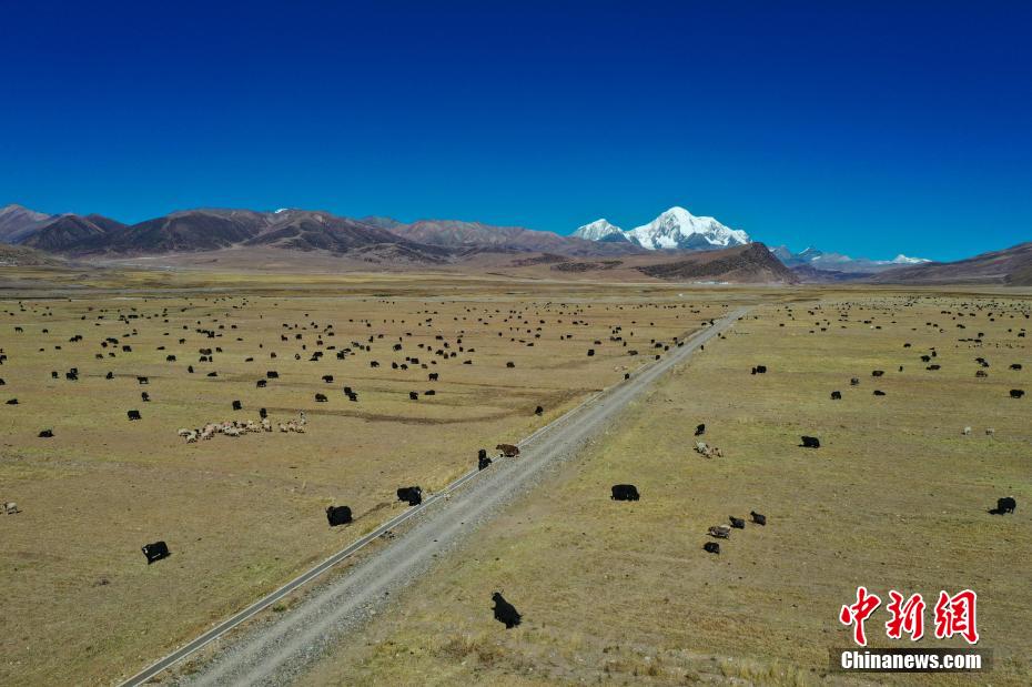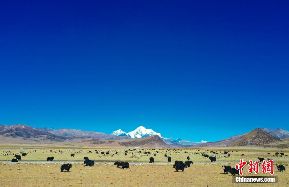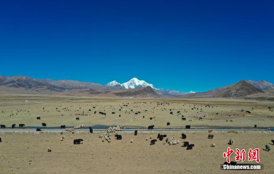 圖為瓊穆崗嘎雪山腳下成群結(jié)隊(duì)的牛羊。(無(wú)人機(jī)照片) 貢嘎來(lái)松 攝