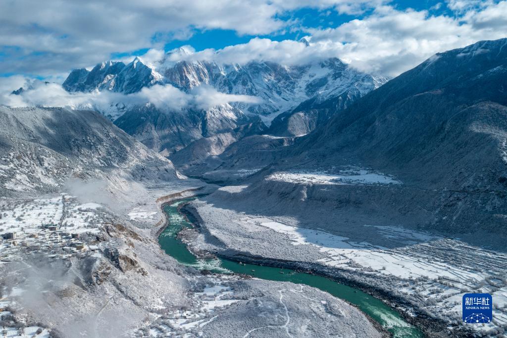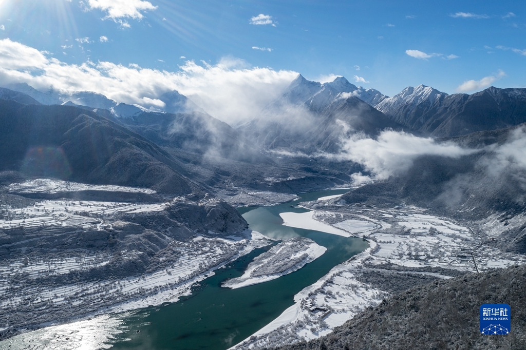 西藏林芝市米林縣派鎮(zhèn)雅魯藏布大峽谷雪景(1月13日攝,無(wú)人機(jī)照片)。新華社發(fā)(董志雄 攝)