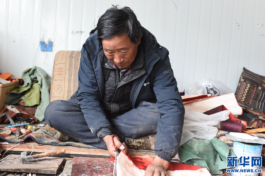 2月24日,曲水俊巴民族手工皮具制作傳承人次仁在制作皮具。新華網(wǎng) 旦增努布 攝