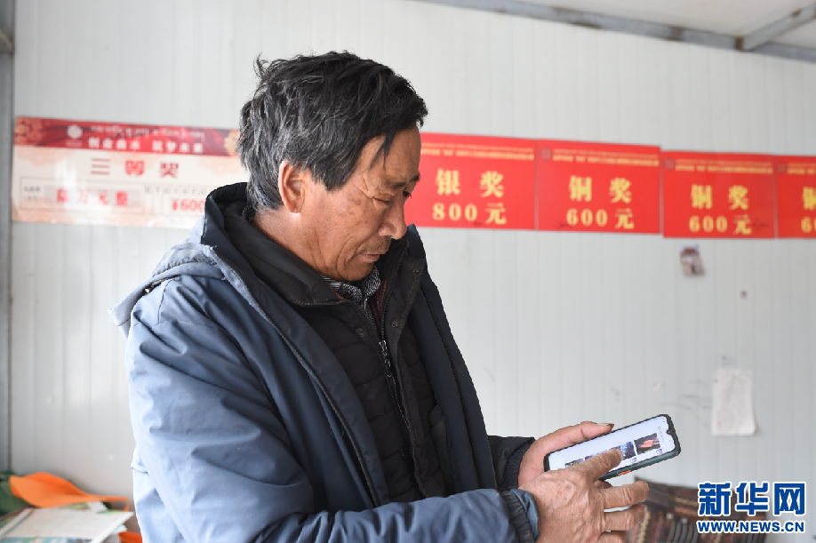 2月24日,曲水俊巴民族手工皮具制作傳承人次仁通過手機上網(wǎng)為客戶介紹皮具產(chǎn)品。新華網(wǎng) 旦增努布 攝