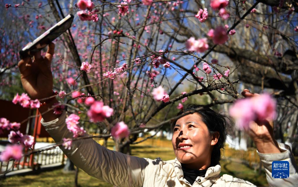 3月20日,一名女子在拉薩市龍王潭公園內(nèi)的春花前自拍留影。新華社記者 覺果 攝