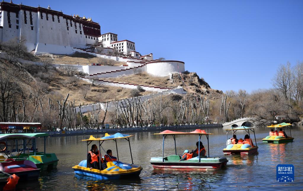 3月20日,在布達拉宮腳下的龍王潭公園內(nèi),游客乘船游玩。新華社記者 覺果 攝