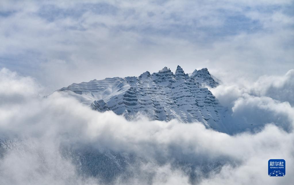 這是在波密縣拍攝的桃花掩映下的雪山(4月18日攝)。新華社記者 晉美多吉 攝
