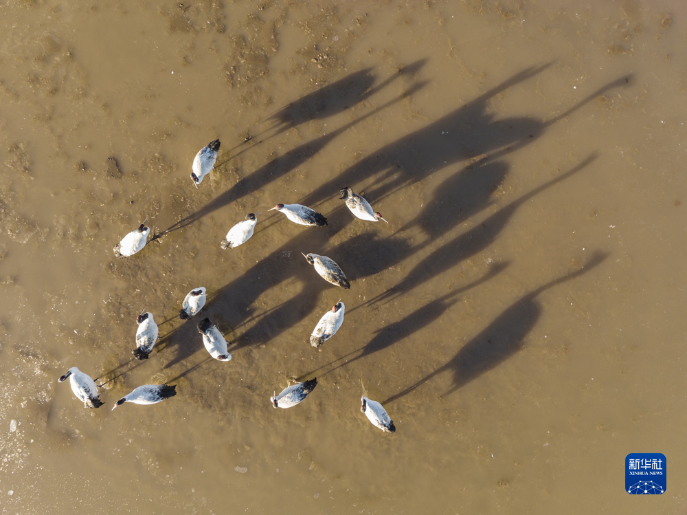 拉薩市林周縣卡孜水庫拍攝的黑頸鶴(3月1日攝,無人機照片)。新華社記者 孫非 攝