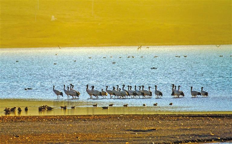 圖為黑頸鶴在雅魯藏布江畔覓食、嬉戲。袁相普 攝