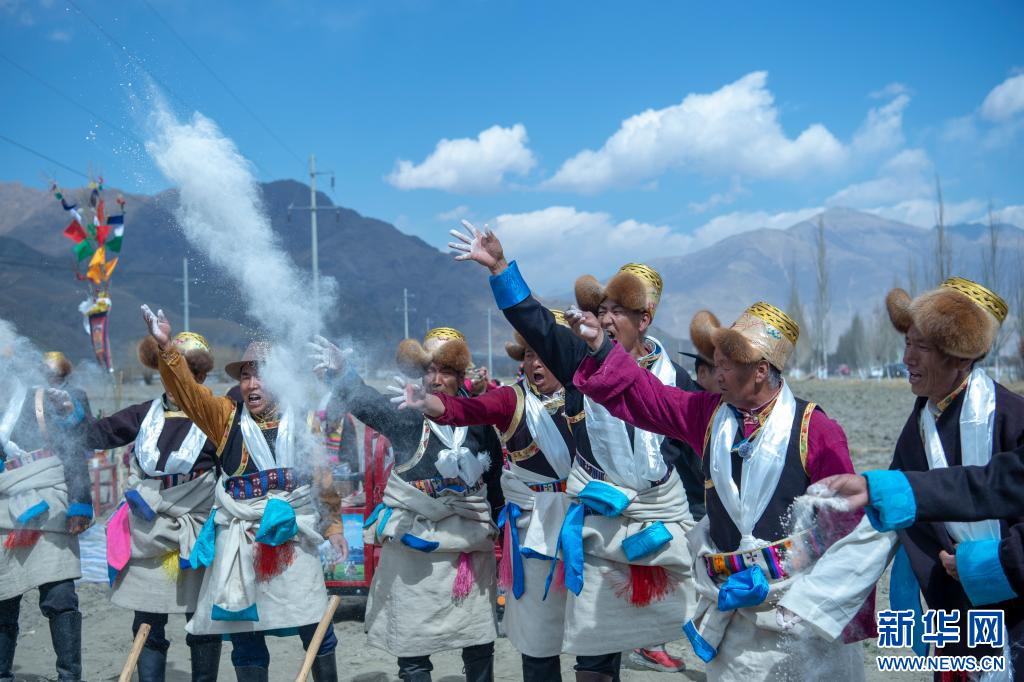 3月16日,克松社區(qū)居民在參加春耕儀式,播撒種子。新華網(wǎng) 旦增努布 攝