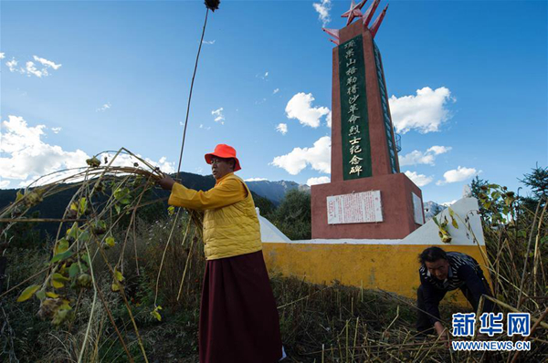 圖為頂果山寺第39世活佛丹貝降參(左),繼承前世活佛對紅軍的深情厚誼,堅持尋找、精心收藏當年紅軍的戰(zhàn)斗遺物和文物,維護著頂果山格勒得沙革命烈士紀念碑。