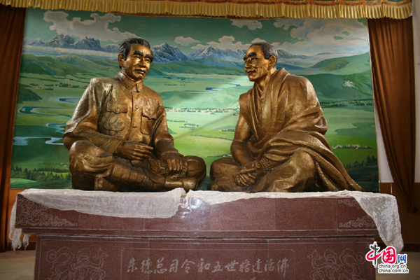 圖為甘孜自治州白利寺,五世格達活佛紀念館,陳列著紅軍總司令朱德和五世格達活佛促膝長談的塑像。