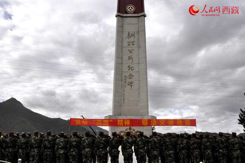 圖為2014年8月9日,武警交通官兵在位于拉薩的川藏青藏公路紀(jì)念碑前宣誓,紀(jì)念川藏青藏公路通車60周年。圖片來(lái)源:人民網(wǎng)