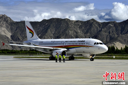 圖為2011年7月26日,西藏航空公司成立暨首航儀式在拉薩貢嘎機(jī)場(chǎng)舉行。圖片來(lái)源:中新網(wǎng)