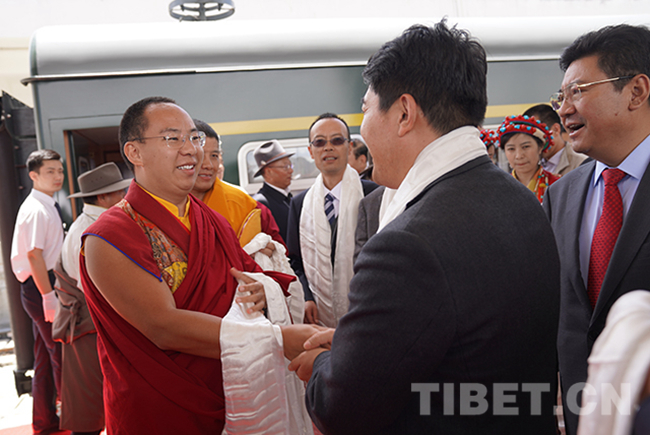 日喀則市有關(guān)領(lǐng)導(dǎo)在火車站迎接十一世班禪。攝影:王淑