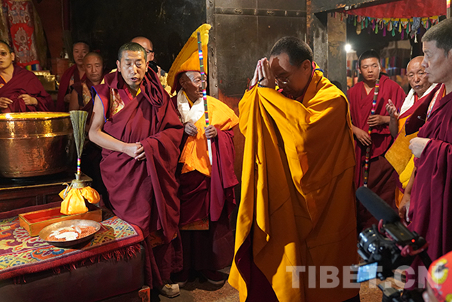 在措欽大殿,十一世班禪虔誠叩拜了供奉于此的釋迦牟尼佛像和宗喀巴塑像,并與僧眾共同念誦經(jīng)文。