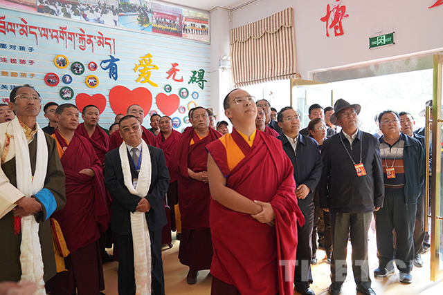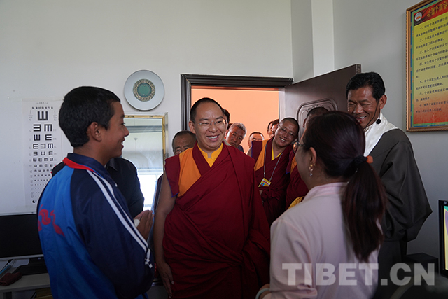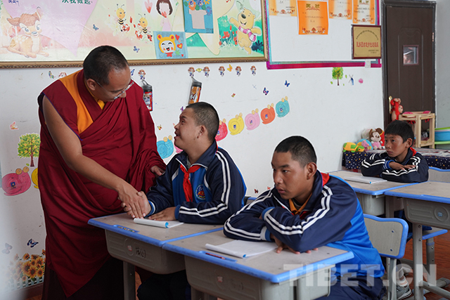 圖為十一世班禪在學校康復(fù)區(qū)與工作人員交流。攝影:王淑