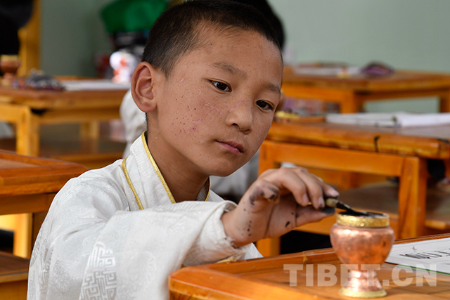 圖為藏文書法室里孩子們正在練習書法。攝影:扎西