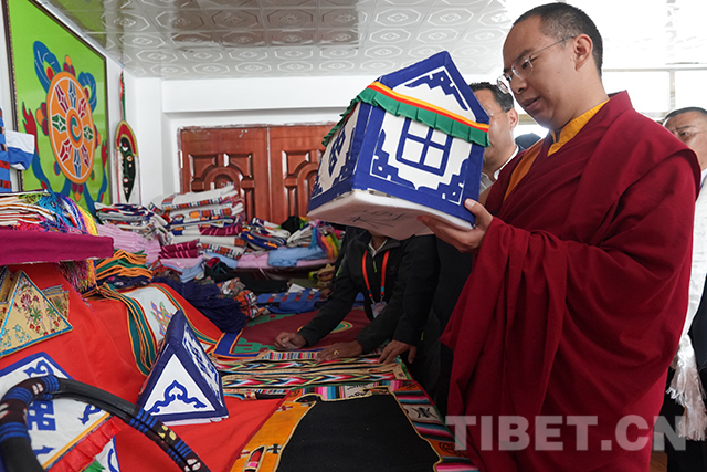 十一世班禪仔細觀看學校殘疾人職業(yè)教育中心里的作品。攝影:王淑