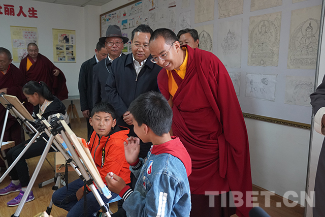 美術(shù)室里,十一世班禪與小“畫家”們交流。攝影:王淑