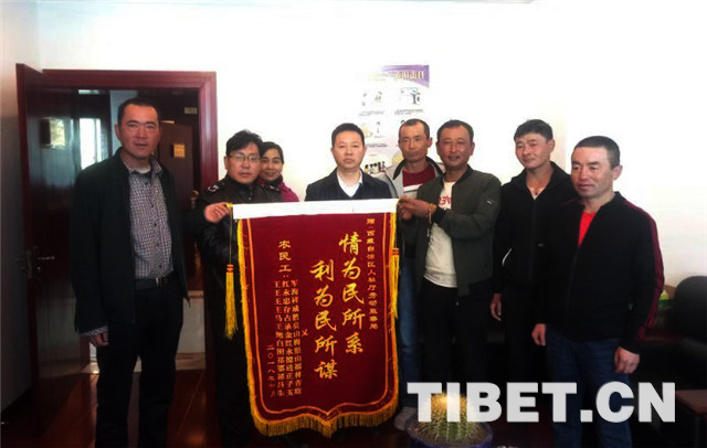 圖為祁某等14名農(nóng)民工為西藏自治區(qū)人社廳送錦旗。