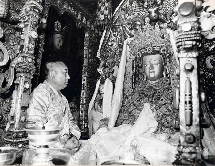 十世班禪大師在大昭寺朝拜釋迦牟尼佛,1982年。劉麗嘉攝