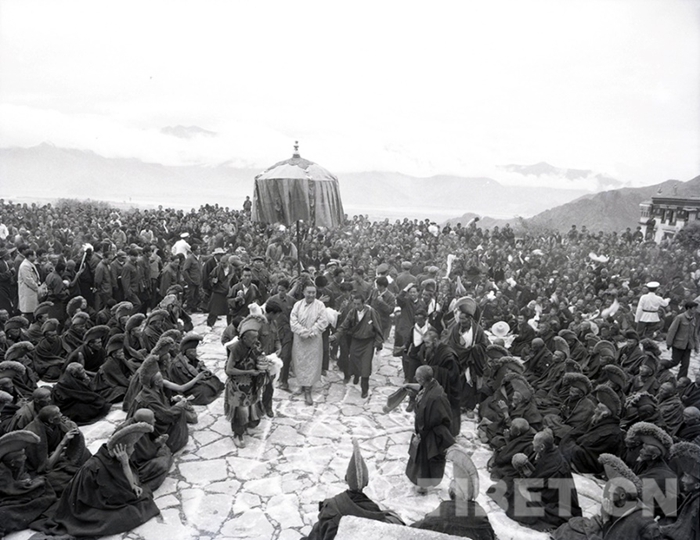 十世班禪大師到哲蚌寺進行佛事活動時,受到廣大僧眾的熱烈歡迎,1982年。劉麗嘉攝