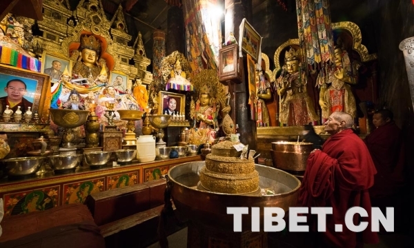圖為信教群眾在十世班禪大師靈塔殿內(nèi)祈禱。攝影:趙耀?! ?/p>