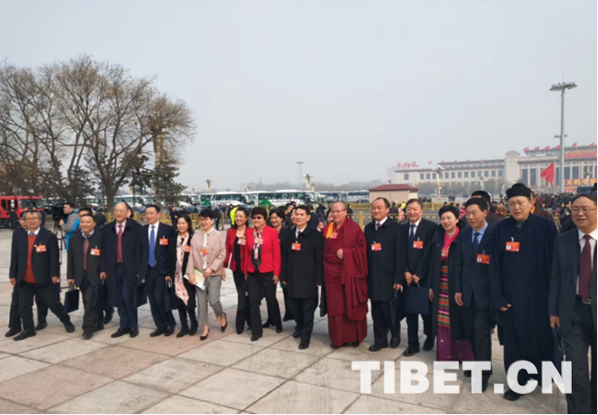 圖為全國政協(xié)委員達(dá)扎?尕讓托布旦拉西降措與其他全國政協(xié)委員一起入場