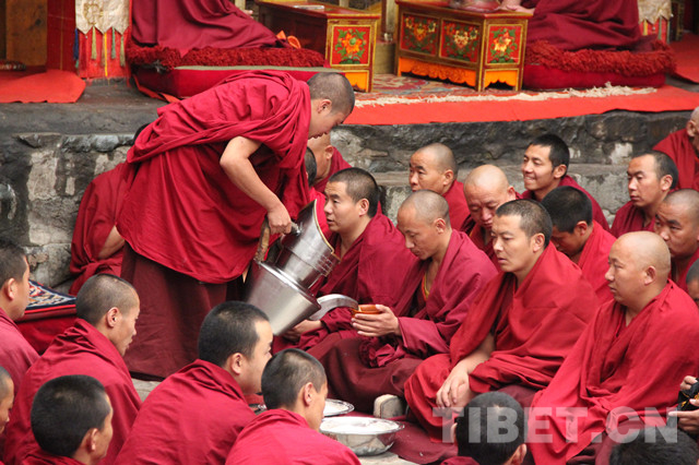藏族社會的飲茶之風(fēng),從藏傳佛教寺院僧眾一天的生活中也能窺見一斑。通常僧人們每日集體飲三次茶,即在早、中、晚三個(gè)時(shí)間段的誦經(jīng)禮佛活動后,由寺院統(tǒng)一熬茶分給他們喝。特別是在舉行法事活動的時(shí)候,僧人飲茶就表現(xiàn)得更為明顯:每當(dāng)舉行法事儀式時(shí),莊重肅穆的經(jīng)堂內(nèi),僧人們誦讀經(jīng)文。待斟茶之際,眾僧從自己懷里取出隨身攜帶的茶碗放在跟前,就有專門負(fù)責(zé)司茶的年輕僧人提著茶壺給眾僧斟茶。