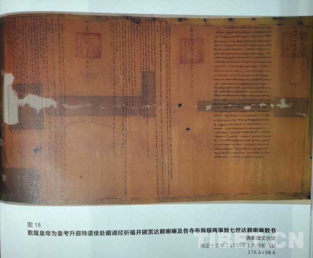 圖為《西藏自治區(qū)檔案館館藏蒙滿文檔案精選》中滿蒙藏文合璧的《乾隆皇帝為皇考升遐特遣使赴藏誦經(jīng)祈福并頒賞達(dá)賴?yán)锛案魉虏际┿y兩事致七世達(dá)賴?yán)镫窌贰z影:李元梅