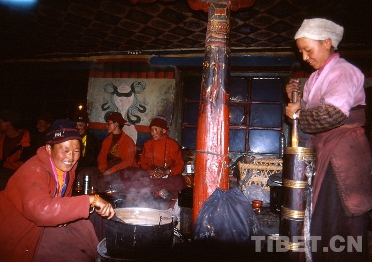紅英是在昌都長大的藏族人,她跟我說起了一段她在內(nèi)地念大學(xué)時(shí)的往事?!拔胰サ絻?nèi)地喝不到家鄉(xiāng)的酥油茶,整天就想啊想,后來有一次幾位藏族同學(xué)聚會(huì),發(fā)現(xiàn)有人從家?guī)Я怂钟蛠?,大家如獲至寶,興奮的弄來一些茶葉,準(zhǔn)備喝一頓饞了好久的酥油茶??墒?,沒有茶桶??!酥油要不斷攪拌才能融到茶水里,酥油和茶水融成的混合物再加上鹽才能叫“酥油茶”??!