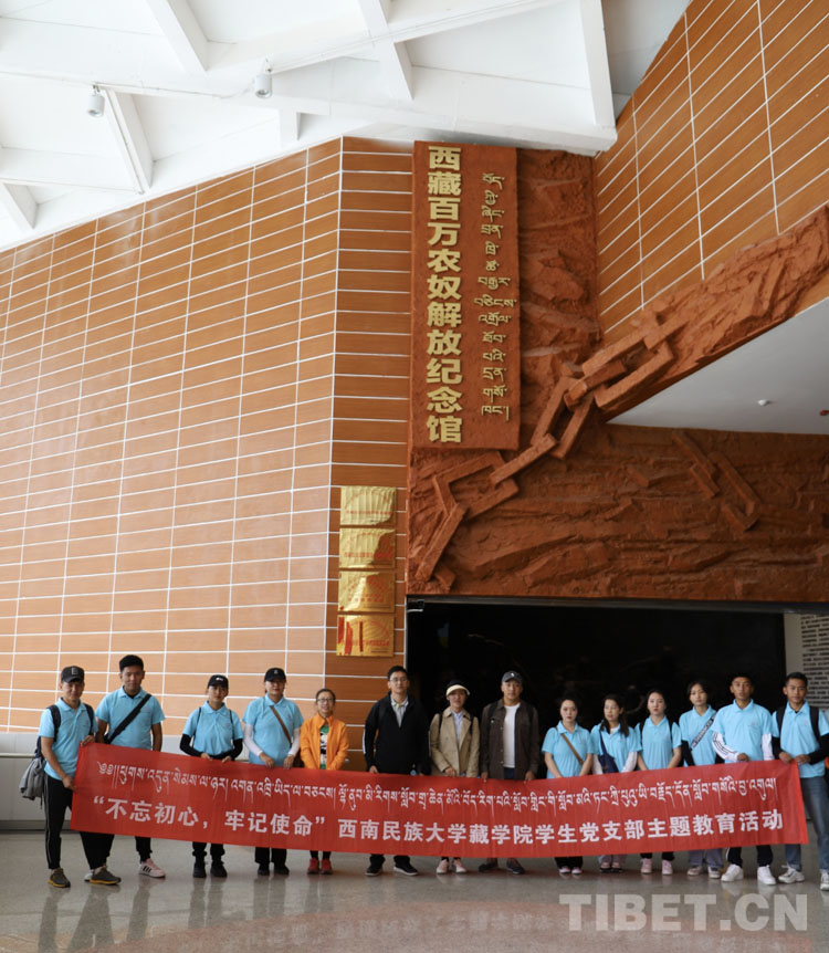 圖為暑期實踐團(tuán)師生代表在西藏百萬農(nóng)奴解放紀(jì)念館前