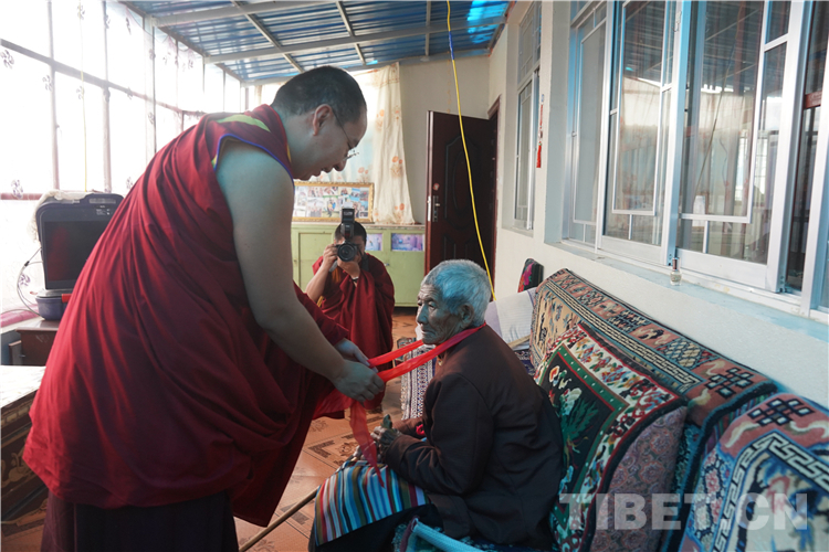 圖為十一世班禪為旺堆平措家中長輩系上長壽金剛結(jié) 攝影:王淑