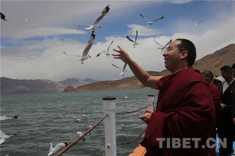 7月26日,十一世班禪觀覽班公湖,考察生態(tài)保護(hù)情況。置身于藍(lán)天綠水和湖光山色中,觀看鳥兒展翅飛翔和低空盤旋,聆聽美妙的鳥鳴聲,讓人感受到人與自然、與動物和諧相處的溫馨場景。