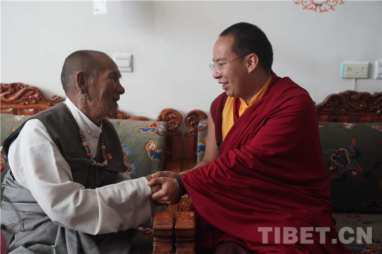 十一世班禪在參加各項(xiàng)活動(dòng)期間,專程看望阿里地區(qū)“雙集中”供(收)養(yǎng)服務(wù)中心的老人和孩子們,并為每一位老人摸頂賜福,噓寒問(wèn)暖,給老人和孩子們帶去了親人般的關(guān)懷。一位老阿媽(嬤啦)當(dāng)場(chǎng)緊緊拉著十一世班禪的手放在自己的額頭,感動(dòng)流淚,嘴里不停地說(shuō)“突吉其,突吉其”(謝謝!謝謝?。?。十一世班禪和老人們圍坐在一起飽含深情地說(shuō):“在黨中央的關(guān)心關(guān)懷下,老人家弱有所扶、老有所養(yǎng)、病有所醫(yī)、住有所居,這充分體現(xiàn)了社會(huì)主義制度的無(wú)比優(yōu)越性,看到你們健康幸福的生活我很欣慰,我會(huì)為你們祈禱,我會(huì)再來(lái)看望你們?!背錆M溫情的一幕使在場(chǎng)人員無(wú)不動(dòng)容。