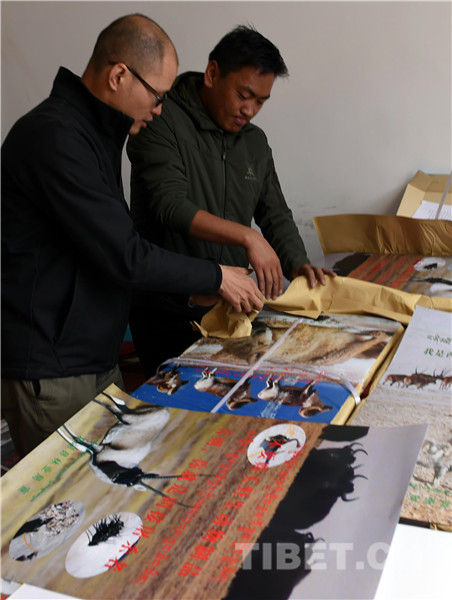 圖為雙湖縣副書記、中石油援藏干部胡勇(左)和雙湖縣森林公安局局長巴桑(右)在整理將要發(fā)放的保護野生動物的宣傳材料。(唐召明2017年7月27日攝)