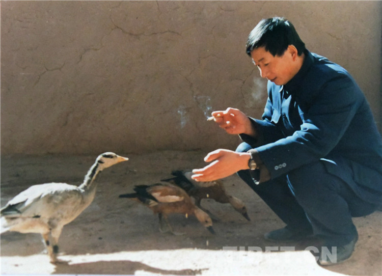圖為原雙湖辦事處干部張新破在給斑頭雁和赤麻鴨喂食。(唐召明1987年攝)