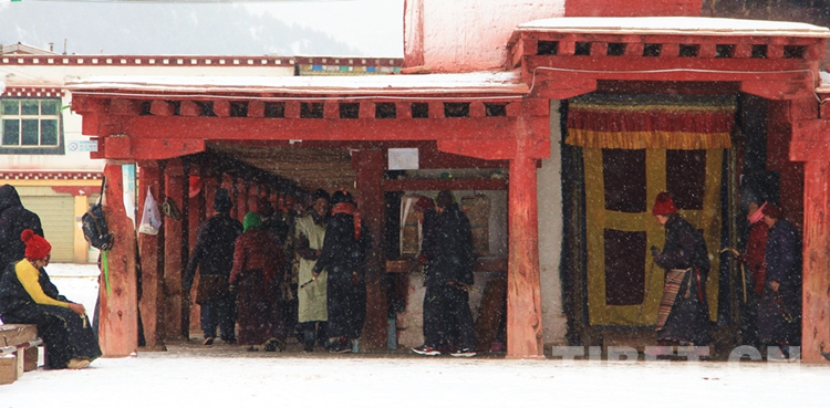 類烏齊寺已有700多年歷史,查杰瑪大殿為類烏齊寺主體建筑,坐西朝東,建筑主體呈四方形,高48米、建筑面積3000余平方米,造型獨(dú)特,宏偉莊嚴(yán),無論外觀,還是內(nèi)部形制,都巧妙地融合了中國藏式、漢式以及尼泊爾建筑風(fēng)格。大殿高三層,層層收攏,一層為厚約2米的土墻,外涂紅、白、黑三色豎形條紋,因此又被稱為“花殿”。圖為冰天雪地中的類烏齊寺查杰瑪大殿 攝影:鄭朔