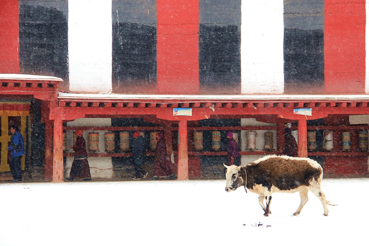 圖為一頭放生牛漫步于大殿外,不畏風(fēng)雪,悠游自在 攝影:李元梅