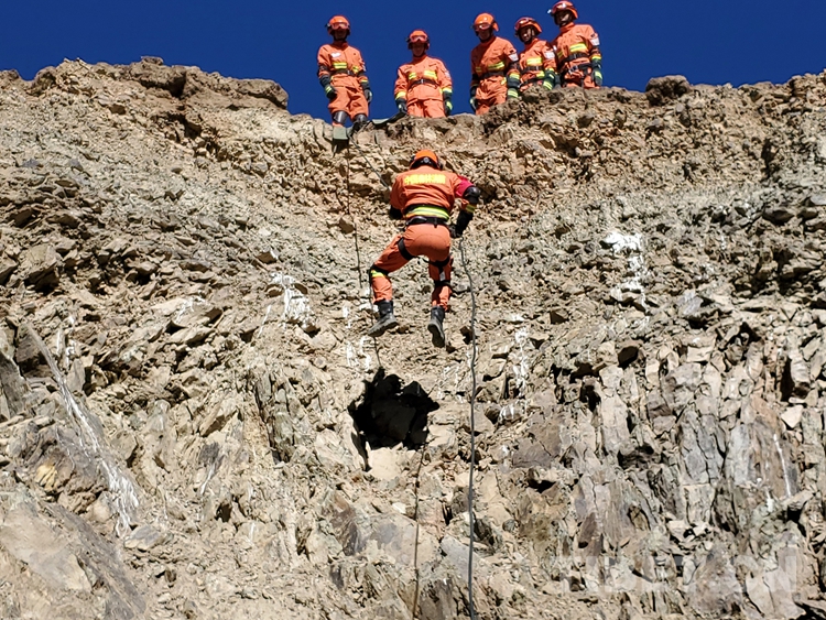 圖為復雜地形下降訓練,進一步提高隊員應(yīng)對各種環(huán)境中繩索救援技術(shù)的綜合運用能力