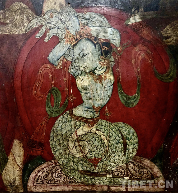 追溯其源頭,在阿里的巖畫中曾經(jīng)有不少龍神崇拜的母題,苯教經(jīng)典《十萬(wàn)龍經(jīng)》亦有記載龍母創(chuàng)生萬(wàn)物的神話。所以,有學(xué)者將這類人獸結(jié)合的龍女形象,看作是苯教母題下古格造像藝術(shù)的產(chǎn)物。