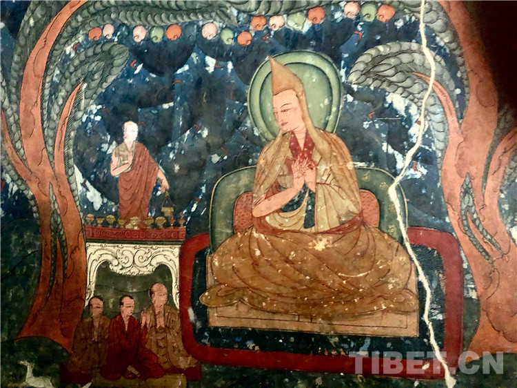 自從朗達(dá)瑪滅佛以來(lái),佛教在吐蕃遭到了致命的打擊,一些僧人避難至遙遠(yuǎn)的阿里,保存了佛教的火種,并且開啟了藏傳佛教的后弘期。托林寺雖遠(yuǎn)在西藏邊緣一隅,卻在藏傳佛教后弘期扮演了重要的角色。11世紀(jì),受阿里地區(qū)的統(tǒng)治者絳曲沃和大譯師仁欽桑布之請(qǐng),阿底峽由納措催成杰瓦、俄列貝希繞、甲尊僧格等五人到印度迎請(qǐng)來(lái)到托林寺,駐寺三年,幫助校譯佛經(jīng)。后又至衛(wèi)藏、拉薩等地譯經(jīng),成為西藏復(fù)興佛教的一位重要人物。關(guān)于這一段歷史的表述,托林寺壁畫中有這樣一幅小圖。圖右邊戴帽者為主佛阿底峽尊者,阿底峽為古印度僧人、佛學(xué)家,聲名極盛。左上角站立者是拉喇嘛絳曲沃,左下三人分別為:譯師納措催成杰瓦、俄列貝希繞、甲尊僧格。