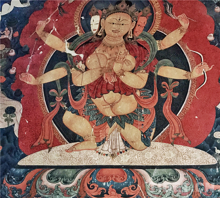 葉衣佛母的識(shí)別標(biāo)志是其身著以樹葉編織的衣裙,左上手持藥枝,其他五臂則持不同法器。葉衣佛母在藏傳佛教中是主管疾病醫(yī)藥的神。三頭六臂九眼,上身坦露,身軀呈現(xiàn)半蹲立姿態(tài),本件作品之風(fēng)格可以見到15世紀(jì)上半葉江孜風(fēng)格在古格繪畫的運(yùn)用:包含以紅色,綠色,藍(lán)色為主的色調(diào);源于尼泊爾的淚滴狀頭冠形式;肩上飄逸的衣帶與衣著上的織繡圖案等。同時(shí),背景中以暈染的深淺來(lái)呈現(xiàn)凌厲的巖石,以及呈卷狀拖曳的祥云圖飾,則是使用了漢地美學(xué)的元素。
