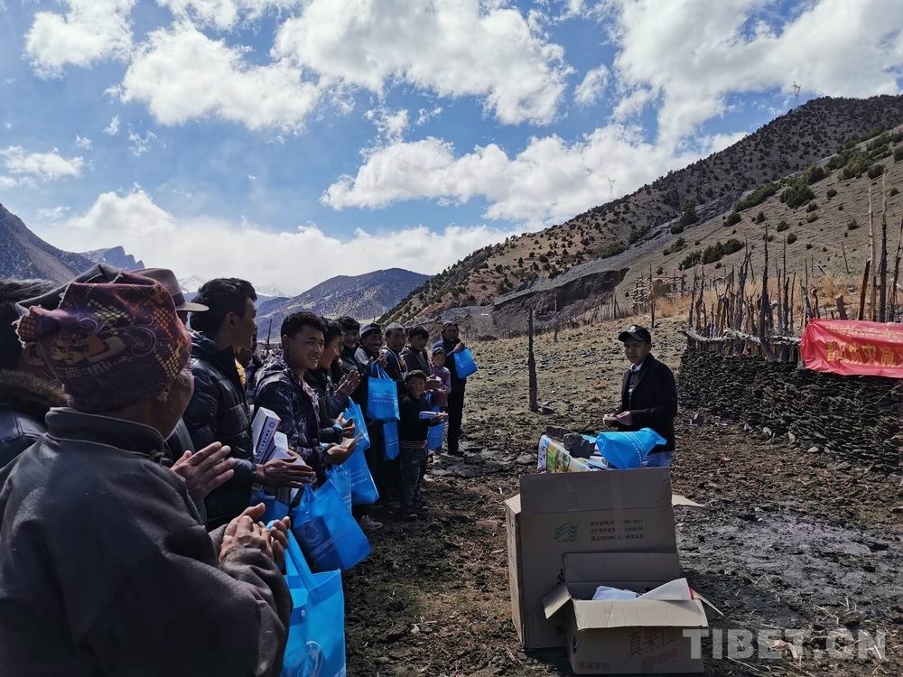 圖為工作人員在邊壩縣拉孜鄉(xiāng)蟲草采挖點向農(nóng)牧民群眾發(fā)放避險手冊等資料