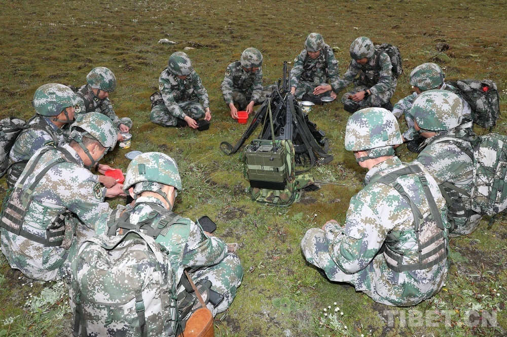 到達(dá)19號界樁后,巡邏官兵們坐在一起,拿出干糧,補(bǔ)充體力。在海拔5000多米的地方,連續(xù)翻山越嶺,體力嚴(yán)重透支,有些官兵一度出現(xiàn)高反,幸虧被戰(zhàn)友及時(shí)發(fā)現(xiàn),吸氧緩解后,大家開始向最終目的地18號界樁進(jìn)發(fā)。