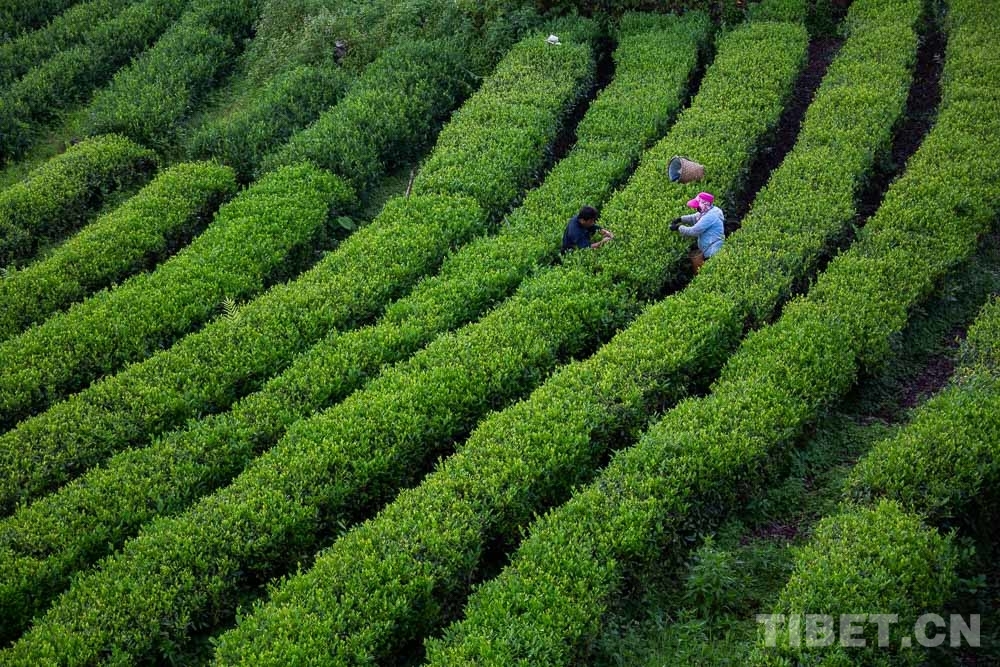 清晨的云霧還未散去,十一世班禪站在平臺(tái)之上俯瞰整片茶園,三三兩兩的茶農(nóng)正在采摘新茶。十一世班禪駐足良久,聽著茶場(chǎng)負(fù)責(zé)人介紹茶樹的生長(zhǎng)狀況等。隨后,十一世班禪走進(jìn)加工車間,仔細(xì)觀看了生產(chǎn)過程,詢問在此工作的當(dāng)?shù)匕傩沼卸嗌?、通過種茶摘掉貧困帽子的有多少等情況。
