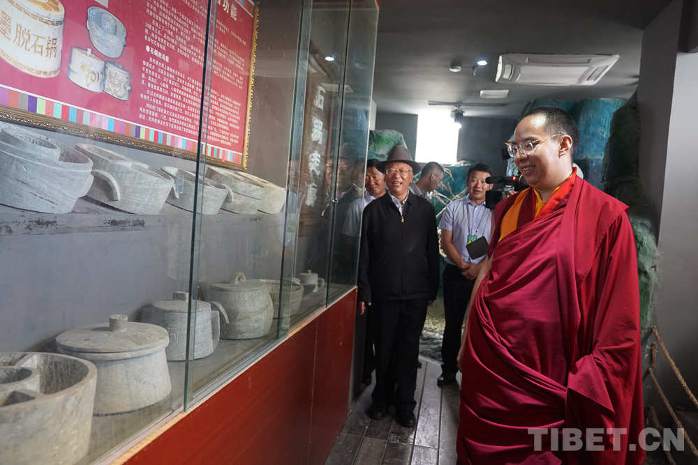 圖為十一世班禪在博物館內(nèi)參觀墨脫石鍋展品 攝影:王淑