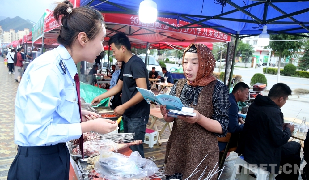 圖為拉薩經(jīng)開區(qū)稅務(wù)干部在夜市地攤宣傳相關(guān)政策