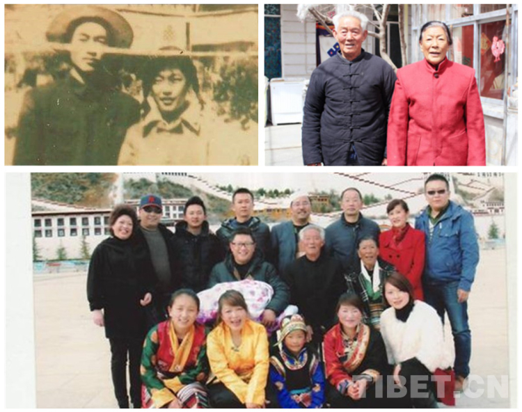 △圖為一個典型的“團(tuán)結(jié)族”幸福家庭。1959年,薄金清隨部隊來到西藏,轉(zhuǎn)業(yè)后到西藏自治區(qū)氣象局工作,1960年與藏族同事、大學(xué)生中巴桑結(jié)婚。而今,全家四世同堂生活在拉薩,20多口人中有藏、漢、回三個民族。左上為薄金清和中巴桑年輕時的合影,右上為薄金清和中巴桑2017年時的合影,下圖為薄金清和中巴桑一家全家福(圖片來源于央視、西藏發(fā)布、拉薩文明網(wǎng))