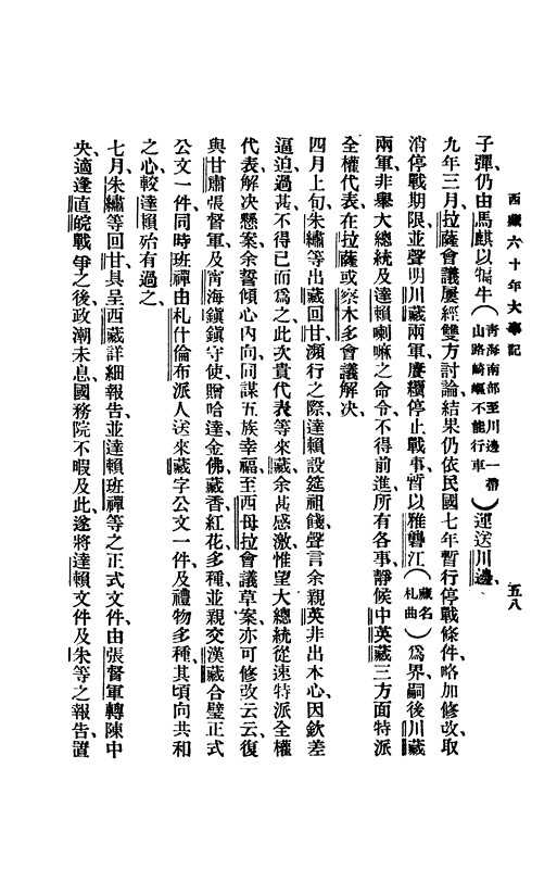 那么,何以后來出現(xiàn)朱繡為代表團(tuán)負(fù)責(zé)人一說呢?原來朱繡進(jìn)藏前,就“于藏事先后得失情形,了如親歷”“每與談及藏事,批隙導(dǎo)竅,理解豁然”。此次,他赴藏耳聞目睹感受更深,痛感“訌內(nèi)虎紛爭(zhēng),烈烈邊風(fēng)急”。 他在代表團(tuán)的報(bào)告未獲重視后,慮及有關(guān)西藏近代歷史尚無一可資借鑒之書,而“國(guó)人與政府又太不明了邊事”,決定將西藏近六十年的大事輯為一冊(cè),以供“留心邊事者一助”。他利用閑暇時(shí)間,查找有關(guān)資料,如條約、公文等,并四處奔走,調(diào)查川藏前后戰(zhàn)爭(zhēng)情形,最終于1925年將書印行問世,為后人了解和研究西藏這段特殊的歷史時(shí)期留下了不可多得的資料。